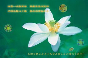 在法輪大法洪傳二十週年及師尊生日之際,弟子向偉大的師尊表示衷心的問候,感謝師尊的慈悲苦度,在弟子失去親人的痛苦中,是師尊挽救了我,給了我第二次生命,弟子無法用語言表達,只有在今後的正法中更加精進。
