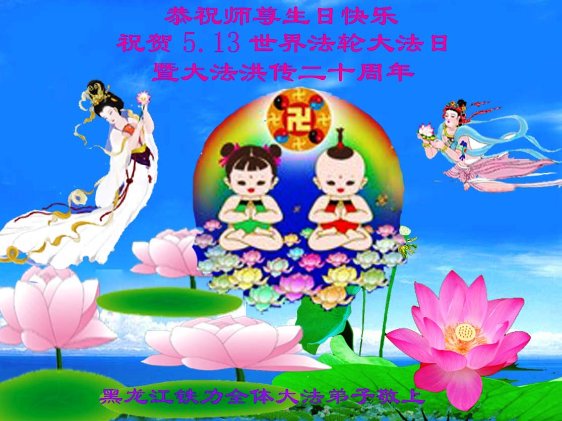 黑龍江鐵力市全體大法弟子恭祝偉大師尊生日快樂,祝賀513世界法輪大法日暨大法洪傳二十週年。