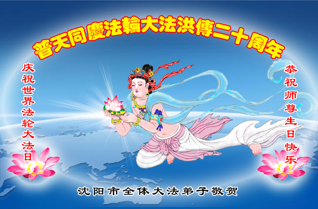 遼寧省瀋陽市皇姑區大法弟子恭祝師尊生日快樂、慶賀世界法輪大法日。