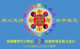 五月十三日是法輪大法洪傳二十週年,這一天也是我們師父的生日,在這個普天同慶即將來臨之際,我們濟南一學法小組大法弟子懷著一顆無比崇敬、感恩之心,祝賀我們最最偉大的師父生日快樂!感謝師尊的救度之恩,我們只有精進再精進,做好三件事,來回報師父的慈悲苦度。