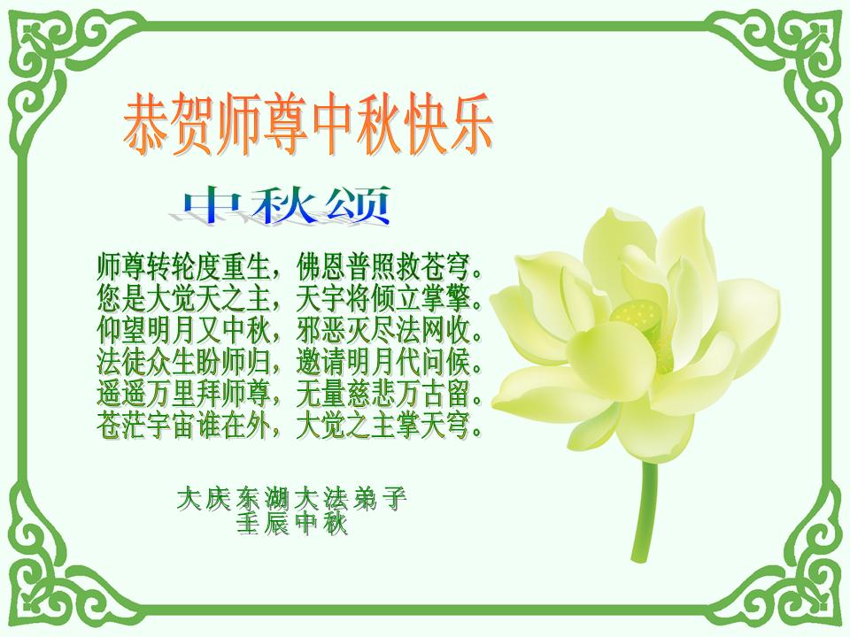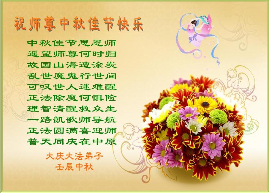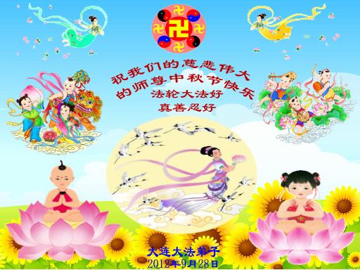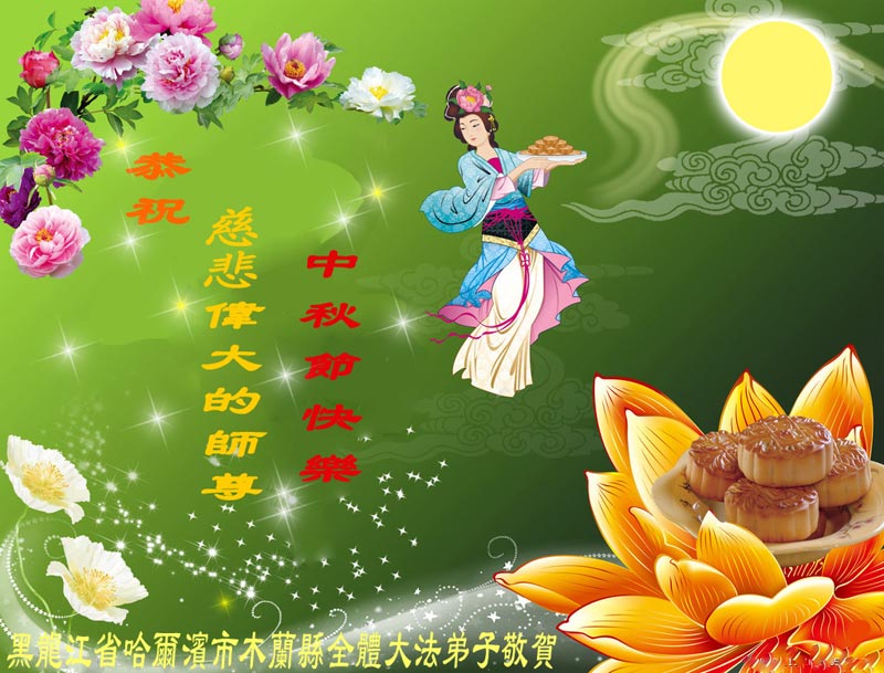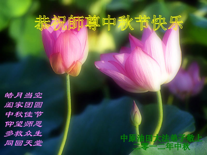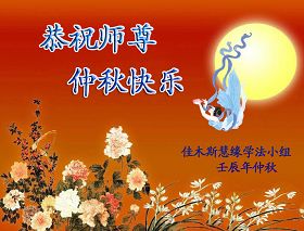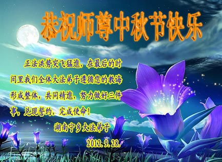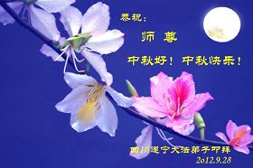 值此中秋佳節之際,我謹代表遼寧省瀋陽市三個學法小組的大法弟子向慈悲偉大的師尊致以中秋節的祝福,願師尊2012年中秋節快樂!