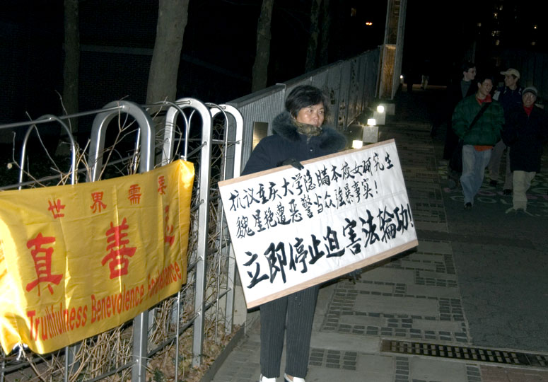 ![]() 重慶大學副校長張四平:我們不會因為信仰讓人休學,除了法輪功。 | ![]() 法輪功學員在賓大沃頓商學院外呼籲停止迫害法輪功 |