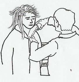 馬增友又拿出警棍在我頭上身上亂打亂捅,甚至動手動腳耍流氓,他企圖把手伸到我的上衣裏摸我胸,他從我脖領處死拽著我的胸衣帶子不放手,我拼命掙扎不讓其得逞,累得他沒有力氣了,他才放棄。後來進來一個警察帶我出去了。沒多長時間,馬增友又把我帶回二樓他的屋子裏,進行了新一輪更殘酷的折磨,還是先打臉,打了一陣子,他用雙手做爪狀使勁摳住我雙眼,邪惡地說:「我把你眼睛挖出來!」又捏住我雙耳,來回亂扯,彷彿要扯下來,之後是嘴唇,同樣是撕來撕去都出了血,恨不得從臉上拽下來,然後又是打臉……他逞兇時是怕曝光的,時不時看看門窗,怕有人經過發現他的邪惡行徑。我明白他的心虛後大喊起來,他害怕極了,馬上用擦腳毛巾堵住我的嘴,我吐出來,他就將臭腳往我嘴裏伸。如下圖示: