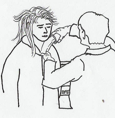 隨後,我被關在一間小屋裏,被編號C99在前門派出所遭到了警察的毒打、猥褻,當時我二十三歲,未婚。從明慧網其他女法輪功學員揭露的前門派出所警察耍流氓的文章中,我得知這個警察叫馬增友(音),文中的插圖是我根據當時的情景畫的。