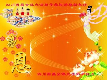 在新年來臨之際,我們涼山全體大法弟子向慈悲偉大的師尊拜年!我們共同祝願師尊新年好! 向師父聲聲道謝:師父辛苦了!在新的一年中,我們會更加努力精進實修,多學法,學好法,修好自己,廣講真相,解體邪惡,多救生,不辜負師尊的慈悲苦度。