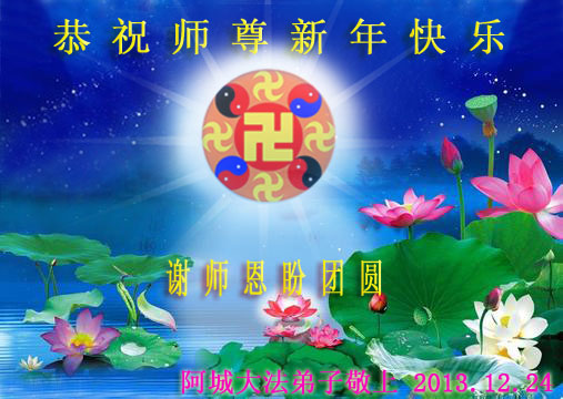 慈悲偉大的師父您好!弟子讓您操心了,在即將過去的二零一三年,弟子在修煉過程中,沒有做的十分太好,弟子對不起師父,對不起眾生,弟子在新的一年裏,要吸取做的不好的教訓,完成助師正法、救度眾生的使命,跟師父回到自己真正的家。請師父加持!