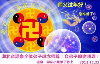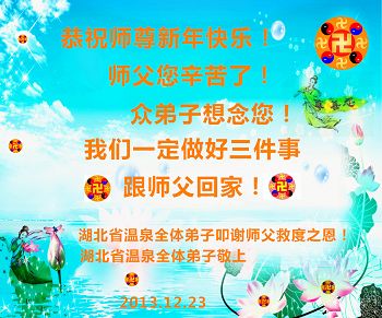 師父您辛苦了!我們想念您!2014年我們深澤縣全體大法弟子會更加精進,開創修煉環境,整體提高,做好三件事,多救眾生,走好我們最後的路。叩拜師父!