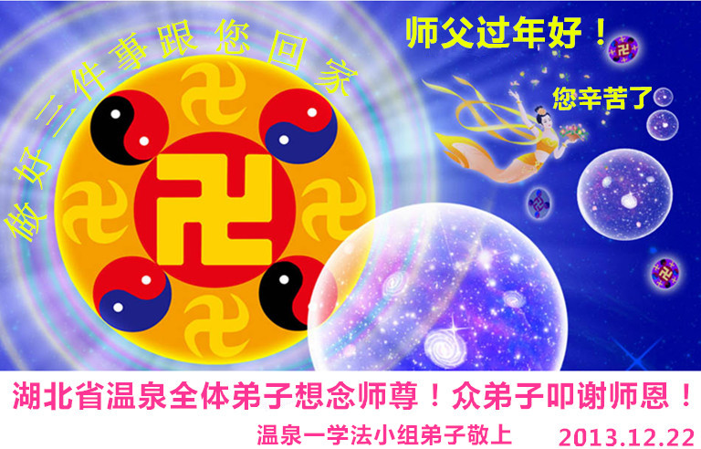 師尊您好!能成為您的弟子我們感到無上榮耀!弟子以無比崇高的敬意感恩您為弟子的操勞和付出。為宇宙眾生所承擔的無邊業力使您在巨關巨難中又度過了一年,挽救了無量無計的生命。請師尊放心,弟子會將師尊賜予的智慧盡一切所能,完成助師正法救度眾生的使命。宇宙中的一切偉績、一切榮耀歸於慈悲偉大的師尊!一切美好來自於師尊!