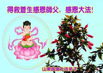 師尊好!我以感恩之心向師尊致以崇高的敬意!深深感謝師父把我從地獄裏救出來,再看護著我、呵護著我、點化著我,教我走好修煉的路。師父您辛苦了!我一定聽師父的話,做好三件事,多學法,多救人。再一次感謝恩師的苦度。