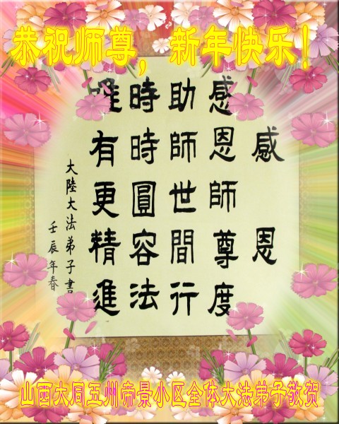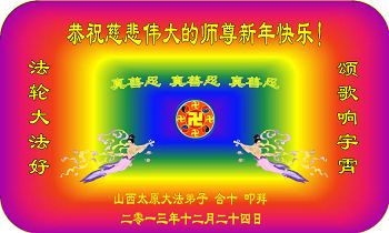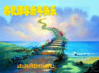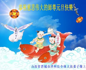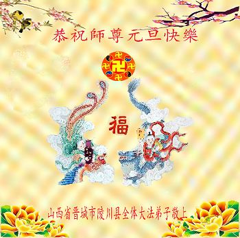 山西省晉城市澤州縣全體大法弟子恭祝慈悲偉大的師尊元旦快樂!感謝師尊的慈悲苦度。弟子知道,現在正法延續的每一天都是師尊用為眾生承受的巨難換來的,千言萬語也道不盡弟子的感恩之心,弟子唯有抓緊時間勇猛精進多救人,做好三件事,整體圓容配合,用大法賦予的神通法力清除一切破壞大法的邪惡,助師正法,救度更多的眾生。