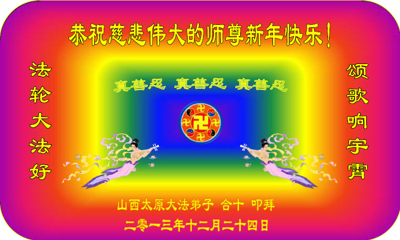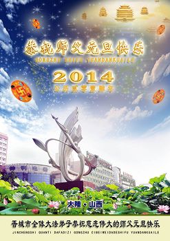 山西省晉城市陵川縣大法弟子感謝師尊的慈悲苦度,恭祝慈悲偉大的師尊元旦快樂!在師尊的慈悲呵護下,我們又迎來了二零一四年。請師尊放心,我們會抓緊有限的時間,把三件事做的更好,多學法,多救人,不斷精進,整體配合,正念正行,不辱使命,願師尊多一份欣慰,少一份操勞。