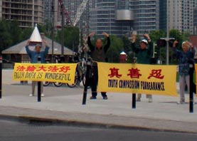 豎立在加拿大多倫多市中心的國家電視塔高553米,是加拿大國家十大景觀之一。法輪功學員在這裏設立了講真相點,十幾年來風雪無阻,天天在這迎接著來自中國大陸的一車車遊客,給他們講真相,勸三退。