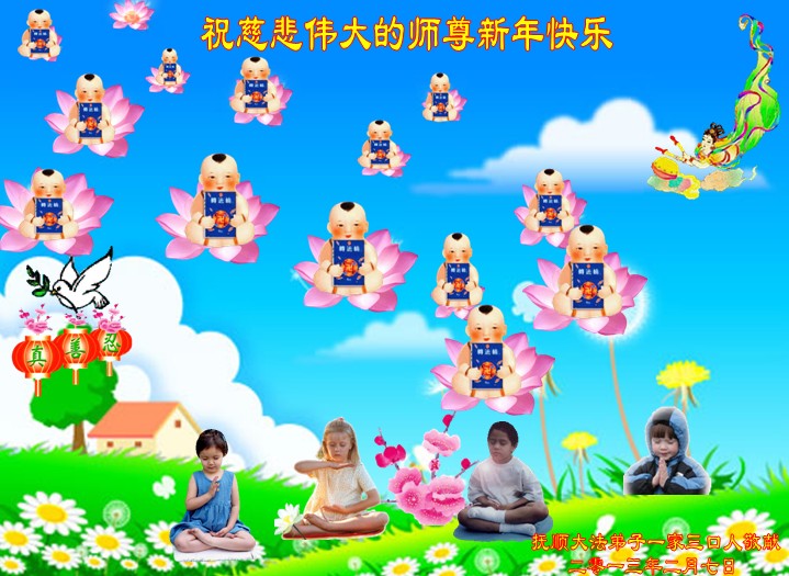 大法弟子攜祖孫三代七口之家敬上