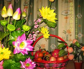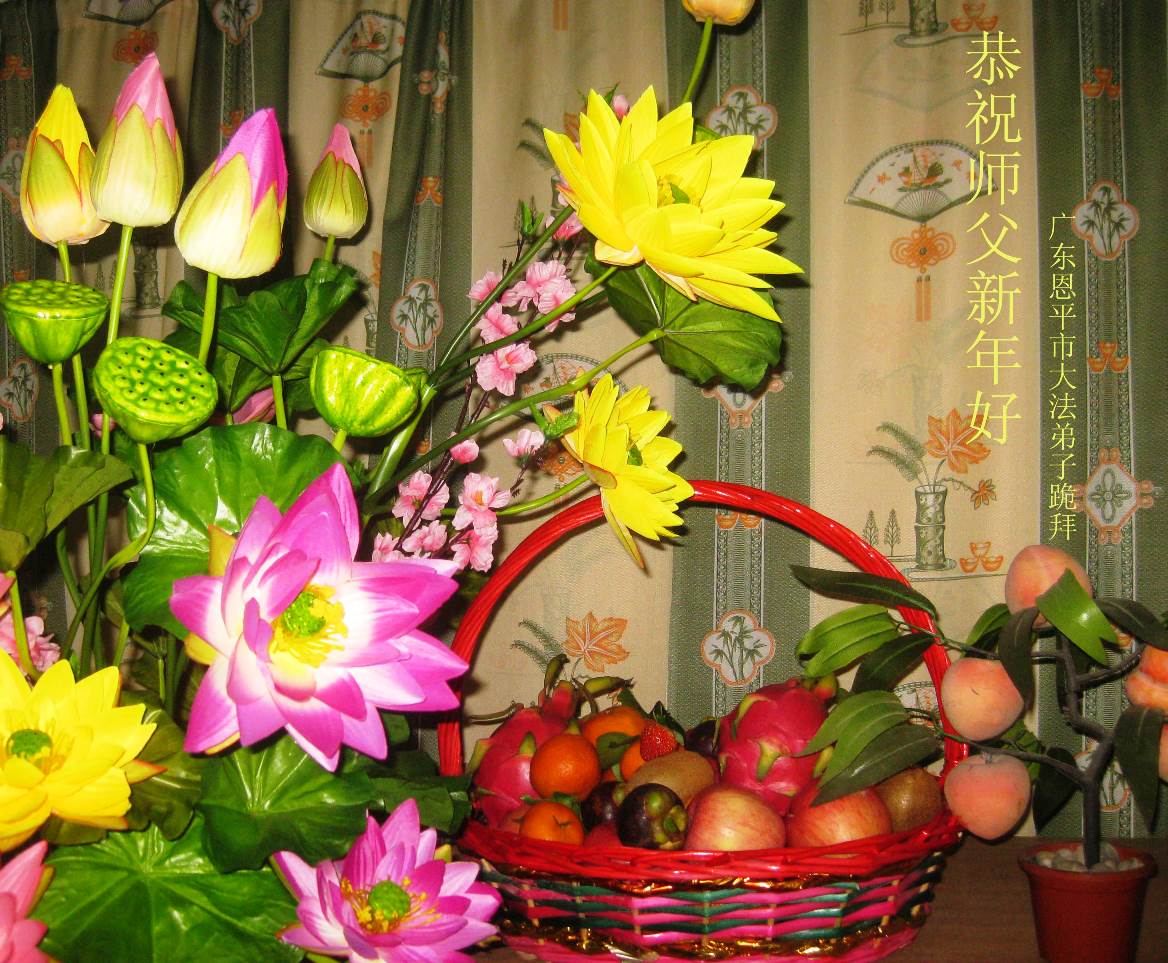 恭祝慈悲偉大的師父新年快樂!新年到來了,我們想念師父,就將美麗的花飾、水果拍攝照片,向慈悲偉大的師父問好:師父!新年好!
