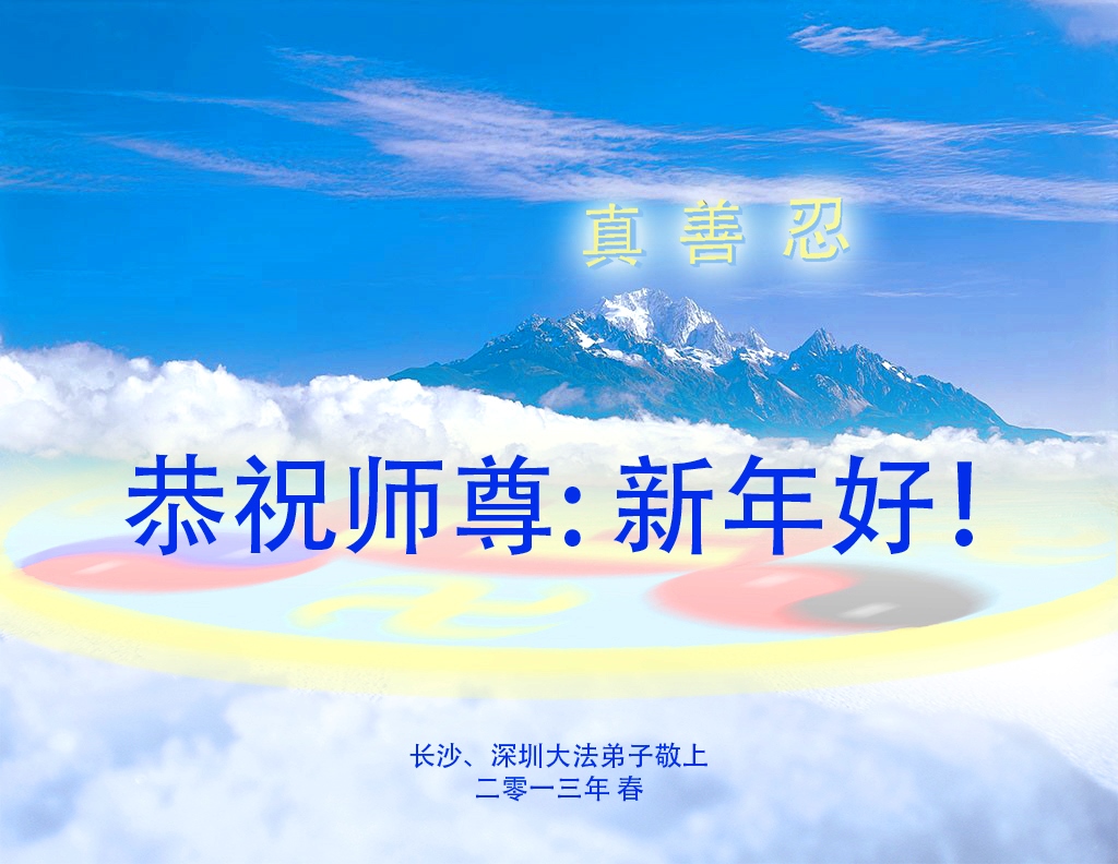 感謝師尊的慈悲救度!師父好!法輪大法好!在新的一年裏,弟子一定更加努力多學法,學好法,向內找,做好三件事,圓滿隨師還!恭祝師尊新年快樂!
