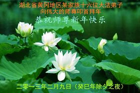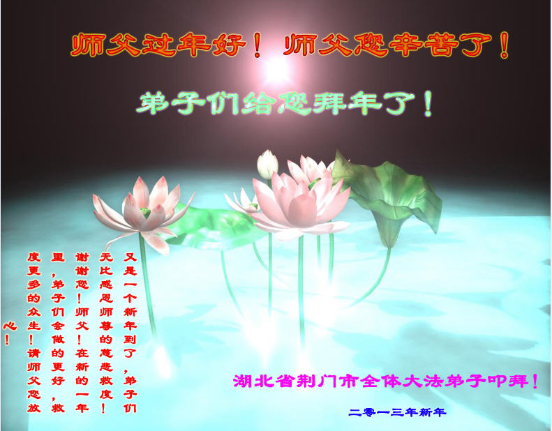 慈悲偉大的師父新年好!在修煉中我們不斷的體會到了修煉的嚴肅與去執著心的重要,只有更加的嚴格要求自己,才能把救度眾生的使命完成的更好。作為真正的大法弟子,只要我們真正在法上提高、真正的按照師父的要求做,我們做的就會越來越正,就會真正的打動眾生的心,真正的從本質上感動世人從而使他們得到救度。師父為眾生所做的一切我們都深深的記在心裏,將永遠的不會忘記!在此我們以最感恩的心同時也代表所有生命向師父發出最誠摯的祝願,衷心祝願慈悲偉大的師父新年好!