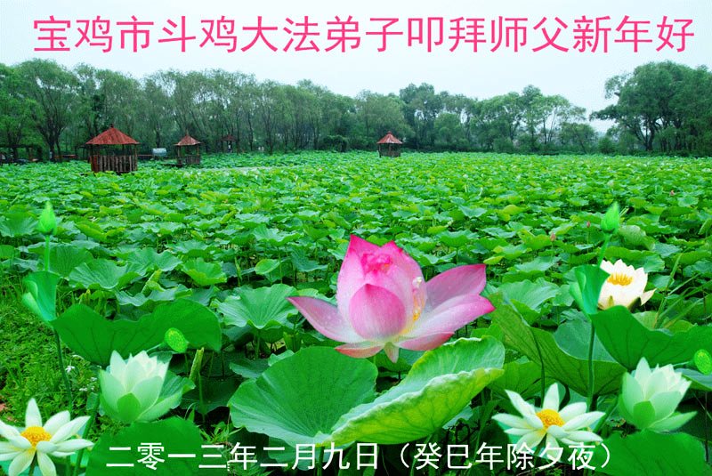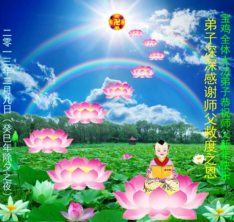 新年來臨之際,寶雞大法弟子向師父問好!師父您辛苦了!弟子們一定謹遵師父的教導,抓緊有限的時間,學好法,遇事向內找,相互配合好,精進實修,救度更多的眾生。讓師父少操心,新的一年裏更快樂。