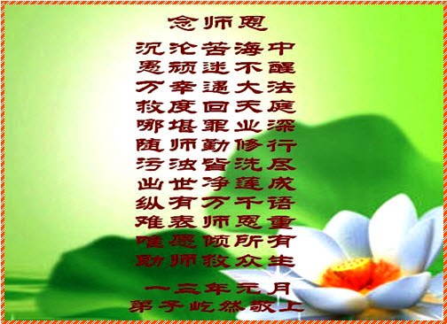 新春佳節倍思親,師尊啊!弟子們十分想念您,盼望師尊早日歸。我們一定要多學法,做好三件事,多救人。弟子們心中明白無以為報,只有精進,精進,再精進!兌現誓約,以謝師恩。