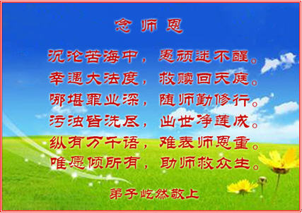 每逢佳節倍思親,師尊啊!弟子們十分想念您,盼望師尊早日歸。我們一定要多學法,做好三件事,多救人。弟子們心中明白無以為報,只有精進、精進、再精進,兌現誓約,以謝師恩。