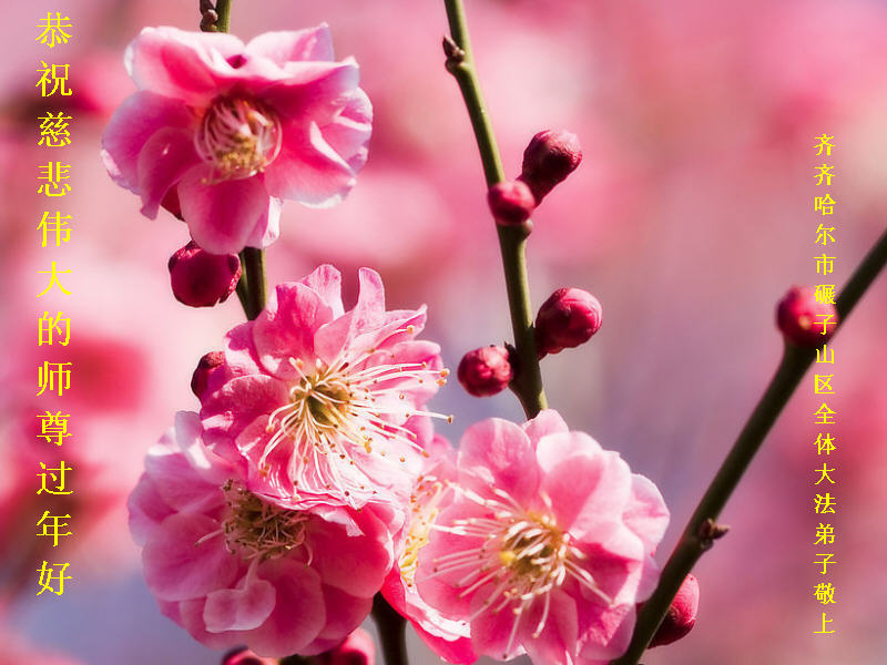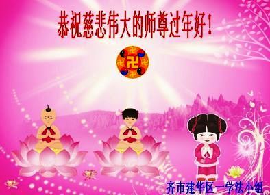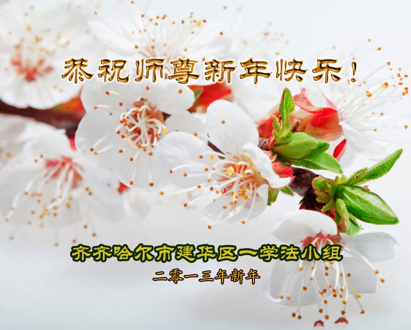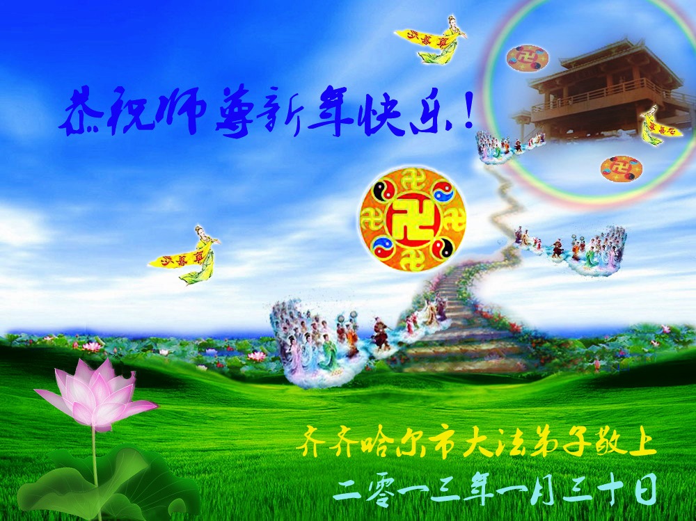 齊齊哈爾市群英學法小組全體大法弟子恭祝慈悲偉大的師尊新年快樂!師尊您辛苦了!弟子們一定跟上師尊的正法進程,認真努力做好三件事,助師救度更多的眾生,兌現史前大願,請師尊放心!