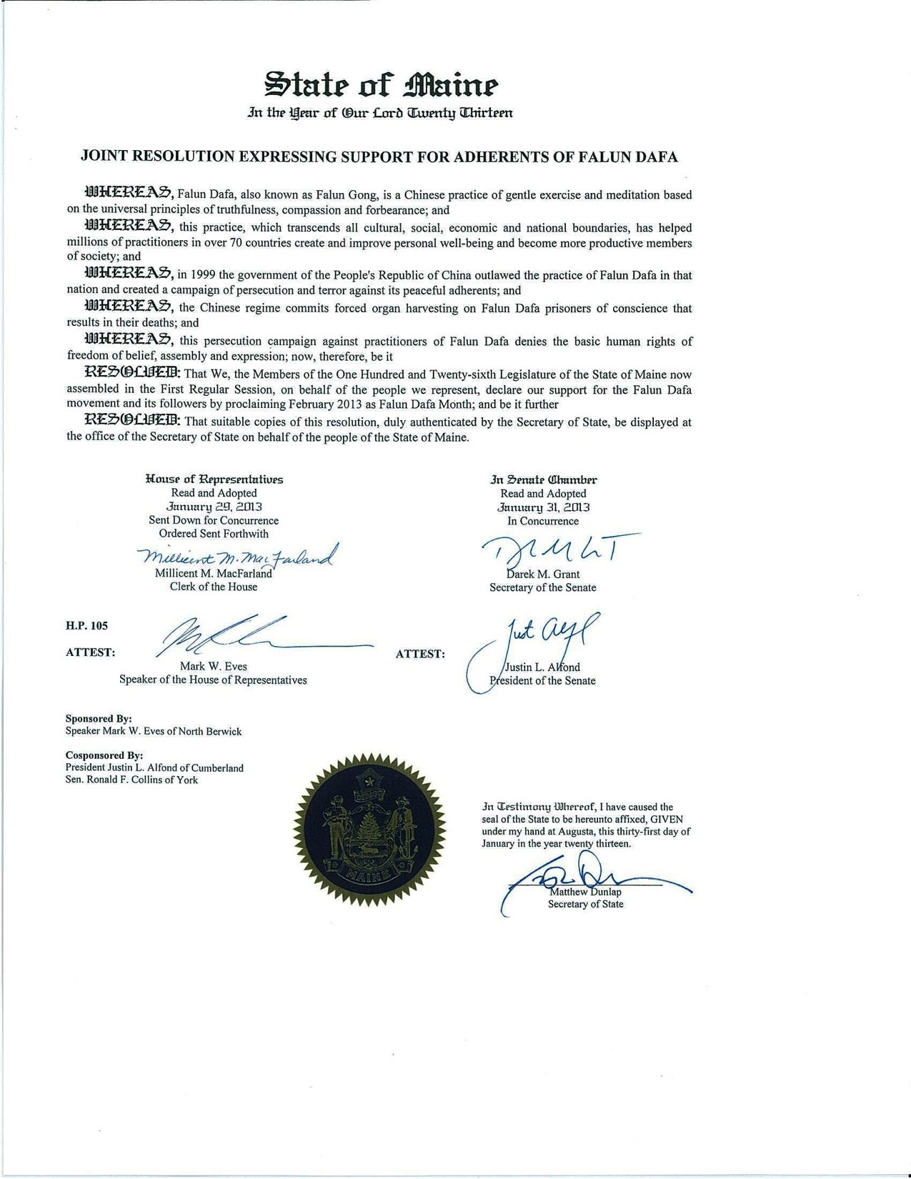 因此,緬因州第一百二十六屆議會的議員現在聚集在第一次正式會議上,代表緬因州人民,宣布我們對法輪大法和法輪大法學員的支持,並將二零一三年二月定為法輪大法月;並進一步決定