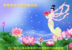 慈悲的師尊:您好!弟子給您磕頭了!在這普天同慶的喜慶佳節到來之際,弟子唯有精進再精進,多學法,學好法,講好真相,多救世人,遇事向內找,做好三件事,不辜負師尊的慈悲苦度,兌現自己的誓約,跟師尊回家。