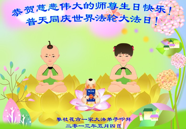 四川省攀枝花一家大法弟子恭賀慈悲偉大的師尊生日快樂!普天同慶世界法輪大法日!