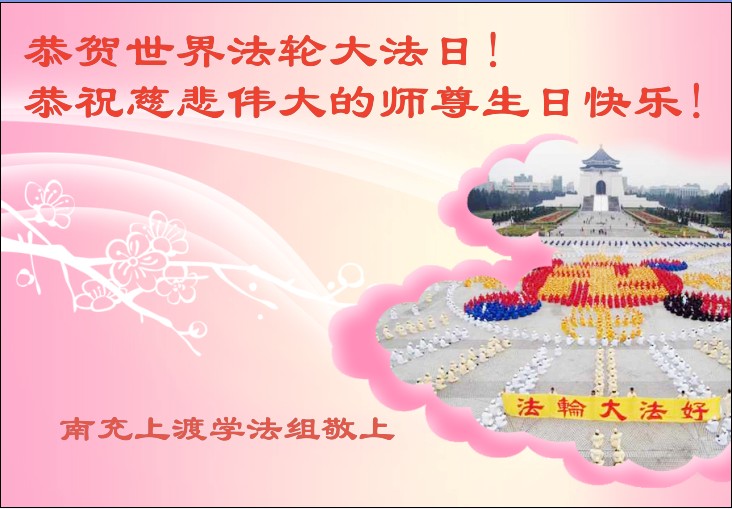 四川省南充上渡學法組大法弟子恭賀世界法輪大法日恭祝慈悲偉大的師尊生日快樂!