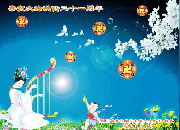 四川省達州市開江縣一女大法弟子恭賀大法洪傳世間二十一週年暨世界法輪大法日!敬祝師尊生日快樂!