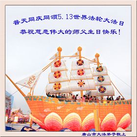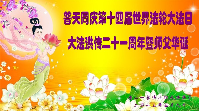 在這普天同慶、同頌、同祝的偉大時刻,我們唐海縣全體大法弟子無限感激慈悲偉大的師尊對我們的救度之恩!師恩浩蕩,難以言表!我們唯有更加精進,修煉如初,緊跟師尊不放鬆。在我們各自的環境裏做好師尊要求的三件事,正念正行,配合整體。在不斷修好自己的基礎上,救度更多的有緣人,解體一切邪惡生命與邪惡因素,徹底解體邪黨邪靈附體及一切邪黨因素。