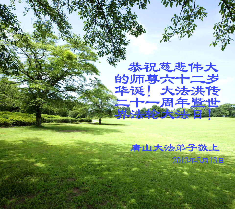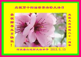 弟子非常想念您!二零一三年五月十三日是法輪大法洪傳二十一週年。在這寰宇同慶的日子裏,我們恭祝慈悲偉大的師尊生日快樂!道一聲:「尊敬的師父,您辛苦了!」