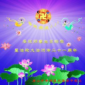 慶祝法輪大法洪傳世界二十一週年!普天同慶世界法輪大法日!恭祝偉大慈悲的師父生日快樂!弟子一定會精進實修,努力做好師尊要求的三件事,不辜負師尊的慈悲救度之恩!堅修大法,圓滿隨師還!