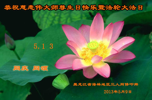 我們能與最最偉大的師父同在!是大法造就的生命們最大的殊榮!在這最殊勝、最美好的日子裏,弟子感恩師尊,縱有千言萬語也難以表達對您和大法的無限敬意,我們會在師尊賦予我們最偉大殊勝的修煉歷程最後的黃金時段最最寶貴的時間裏,做好應該做的三件事,讓師父少操一份心,多一份欣慰!實現、兌現史前誓約,圓滿隨師還!
