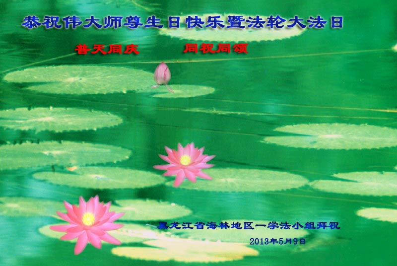 慶賀世界法輪大法日!暨大法洪傳世界二十一週年!我們一定要時時處處以一個修煉人的標準要求自己,讓廠裏的職工都能正面的認識大法,現在我們學法、煉功在廠內已半公開化了,因此有很多人要請寶書《轉法輪》看,但由於人的觀念阻擋著,勸三退還沒有在廠內全面鋪開,但我們相信,隨著學法的深入,在師父的加持下,我們一定要也一定能兌現史前誓約,助師正法,救度這一方眾生。叩拜師尊的慈悲苦度,感恩師尊的佛恩浩蕩!