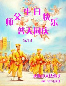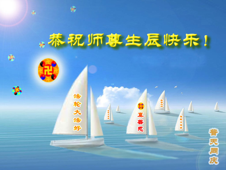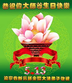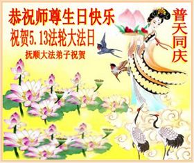 我是大陸的大法弟子,再過十天就是師父的生日,又世界法輪大法日。今天我和同修一起提前祝師父生日快樂!法輪大法好,真、善、忍好!