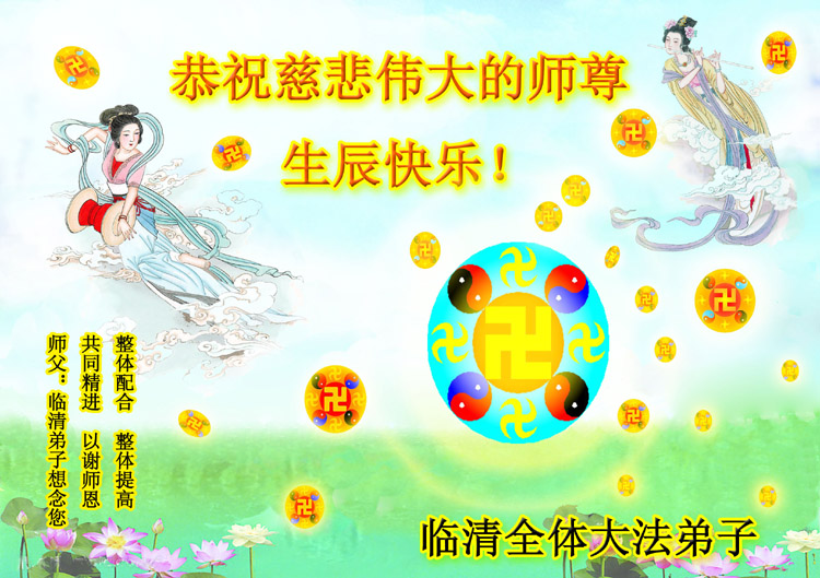 值此師尊壽誕之際,普天同慶,臨清全體大法弟子叩謝師恩!請師父放心,我們一定放下自我,修去人心,圓容整體,共同精進,盡最大努力做好三件事,不辱使命,多救人,讓師父多一些欣慰,少一些操勞!