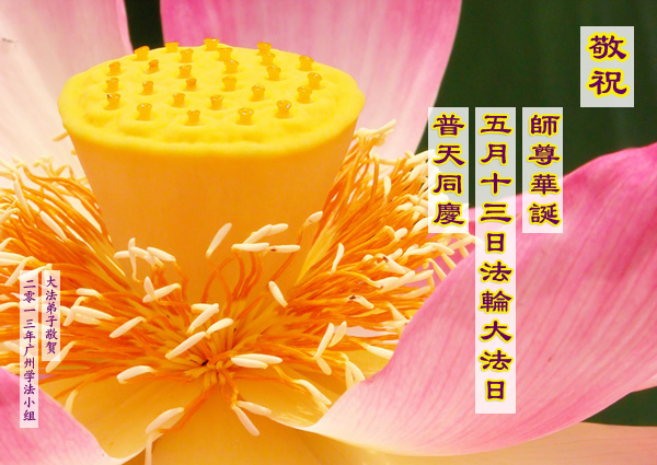 五月十三日是師父的生日,也是世界法輪大法日,我是廣州的一名大法弟子,我代表我們學法小組的全體同修,提前恭祝慈悲、偉大的師父:生日快樂。