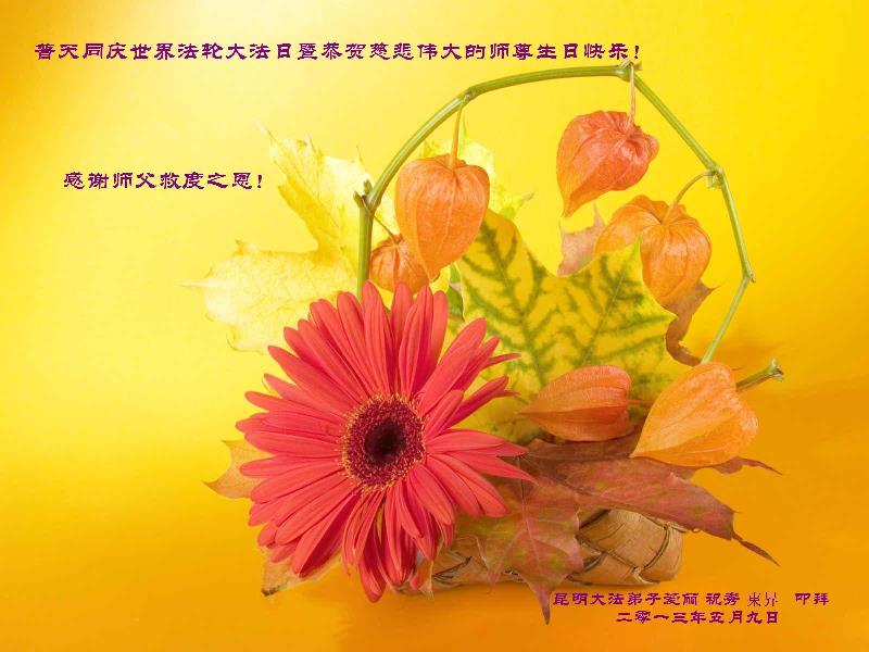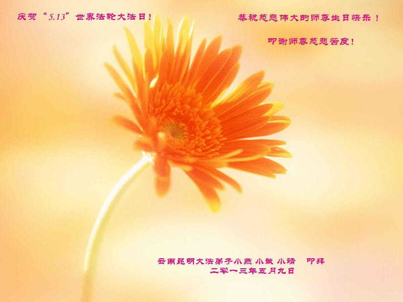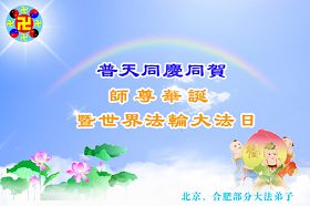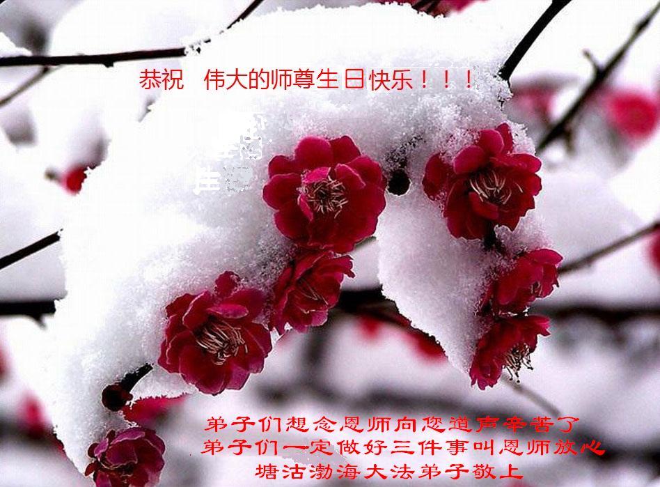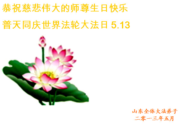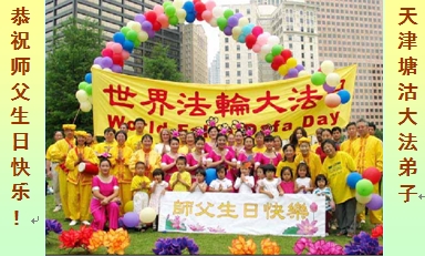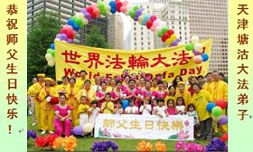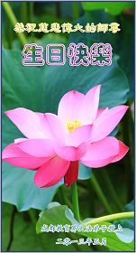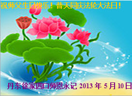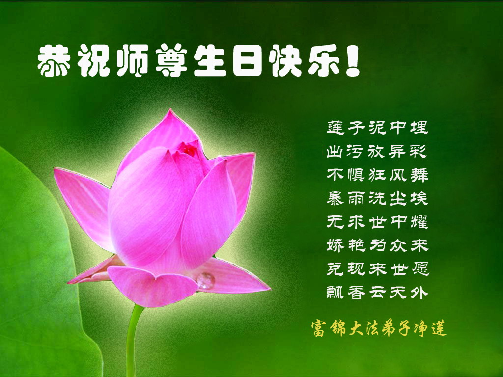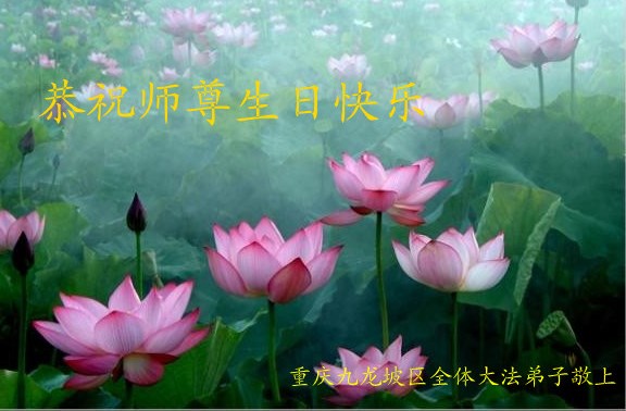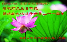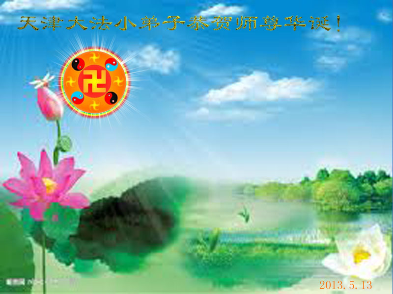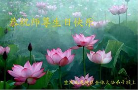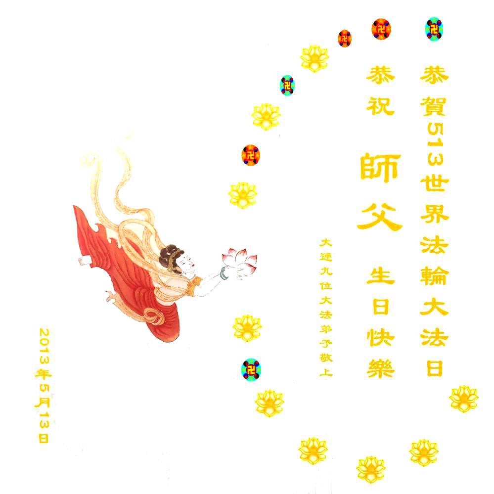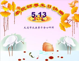 值此(世界法輪大法日)之際,我們大連二個學法小組全體大法弟子,恭祝師尊生日快樂!我們要做好師尊要求的三件事,整體提高,讓師尊多一些寬慰、少一些操勞。
