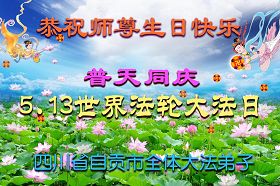 四川成都大法弟子恭祝師尊生日快樂!普天同慶5•13世界法輪大法日!法輪大法洪傳二十一週年!