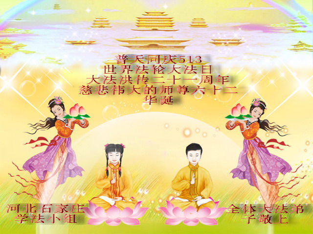 河北省石家莊市橋西區學法小組恭祝慈悲偉大的師尊生日快樂!普天同慶法輪大法日!