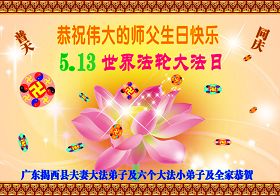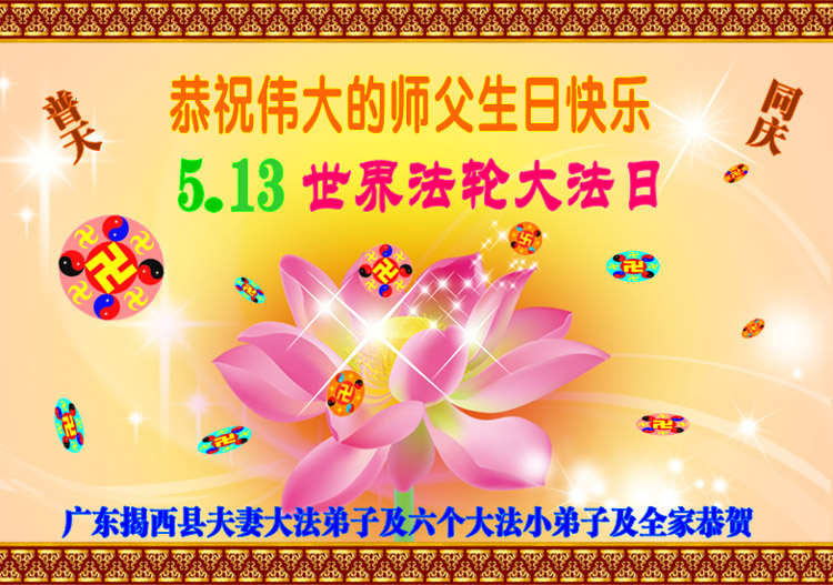 廣東省揭陽市揭西縣夫妻大法弟子及六個大法小弟子及全家恭賀慈悲偉大的師尊生日快樂!並祝賀法輪大法洪傳21週年,弟子全家感恩師父的慈悲救度!