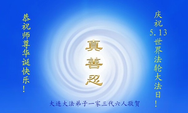 遼寧省大連大法弟子一家三代六人恭祝偉大師尊華誕快樂!慶祝513世界法輪大法日!