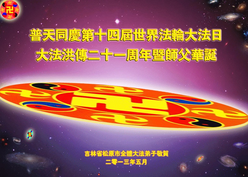 吉林省松原市全體大法弟子恭祝慈悲偉大的師尊華誕!普天同慶第十四屆世界法輪大法日、大法洪傳二十一週年!師尊辛苦了!