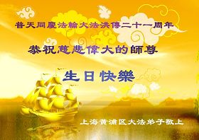 上海黃浦區大法弟子恭祝慈悲偉大的師尊生日快樂!普天同慶法輪大法洪傳世界二十一週年!