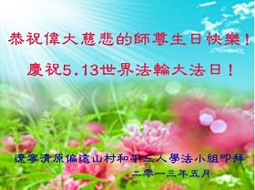 遼寧省撫順市新賓縣一鄉鎮全體大法弟子恭祝師尊生日快樂!普天同慶世界法輪大法日!