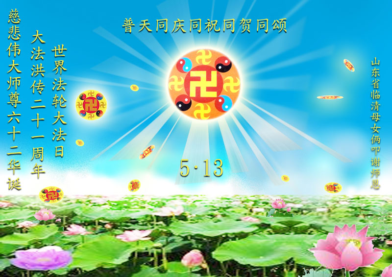山東省聊城市臨清市母女倆祝賀5.13世界法輪大法日!恭祝慈悲偉大的師尊生日快樂!