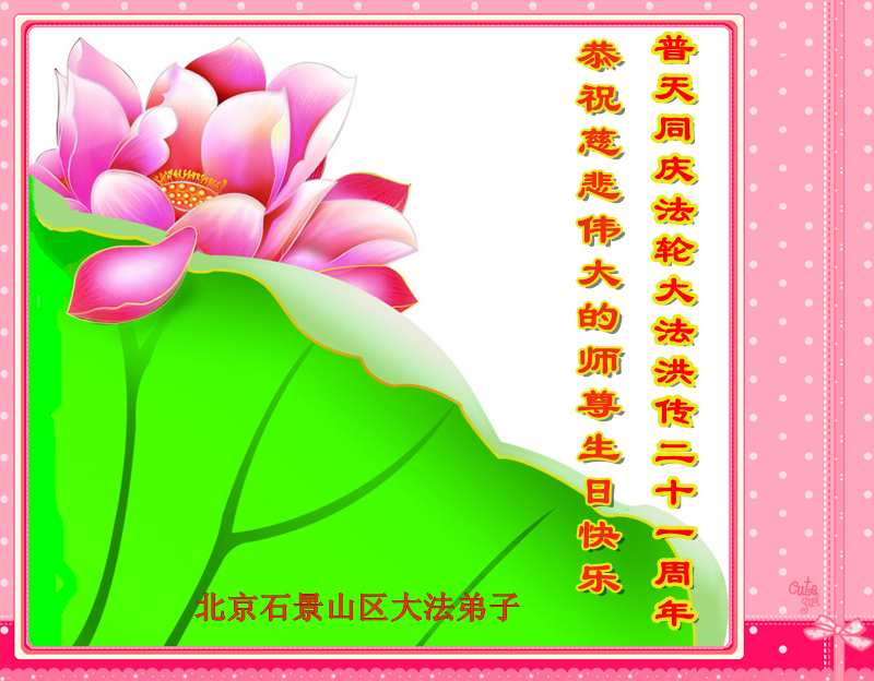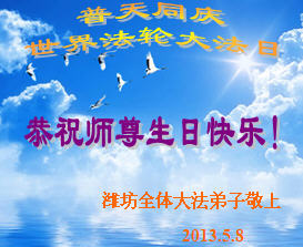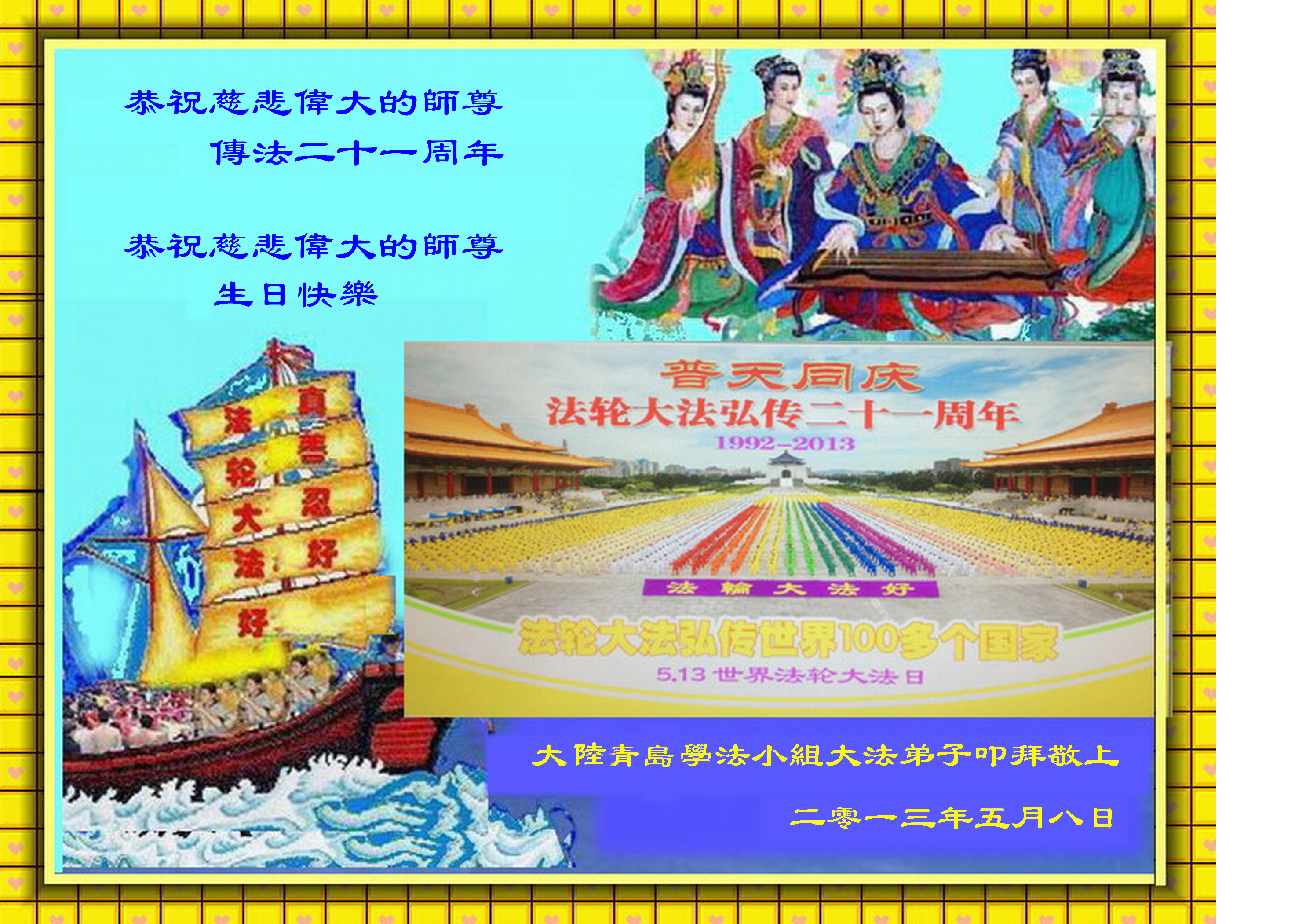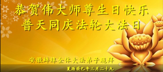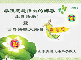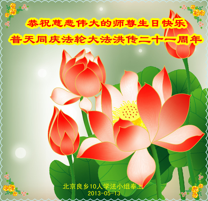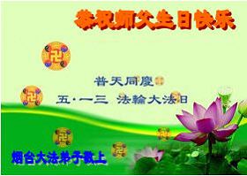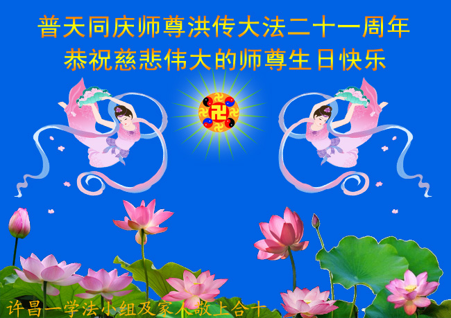 我們是一九九六年得法的老弟子,在慈悲而偉大的師尊呵護下走過了十七年的正法之路,值此法輪大法洪傳二十一週年暨師尊生日,我們全家遙祝師尊生日快樂!師尊您辛苦了!家鄉弟子盼望早日與師尊團聚。