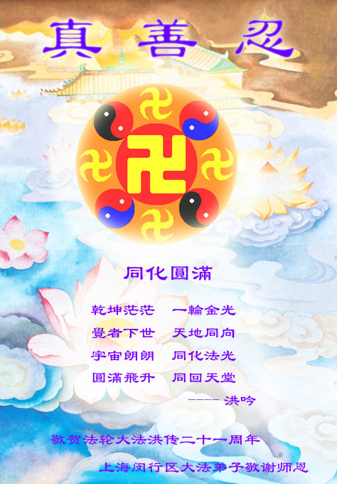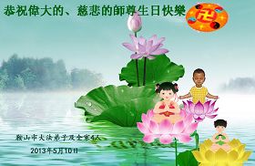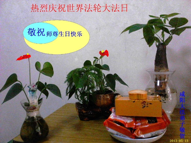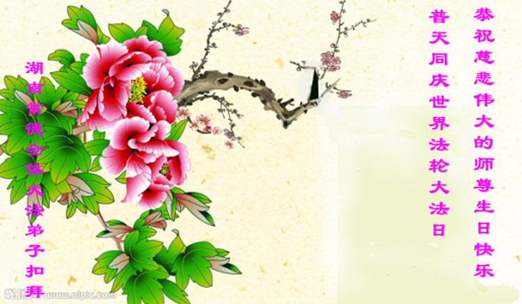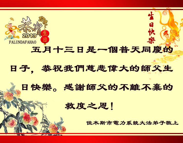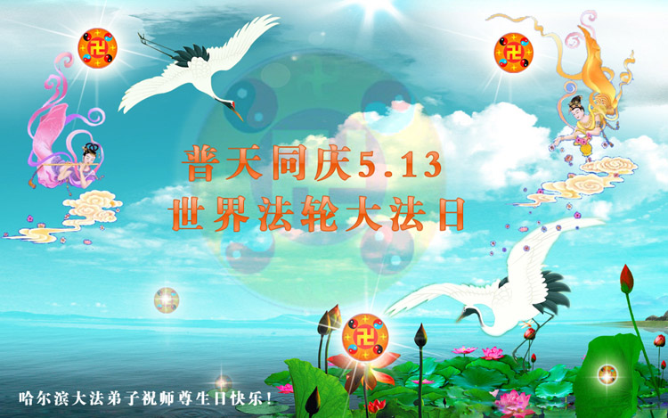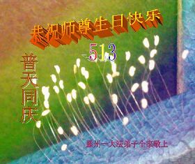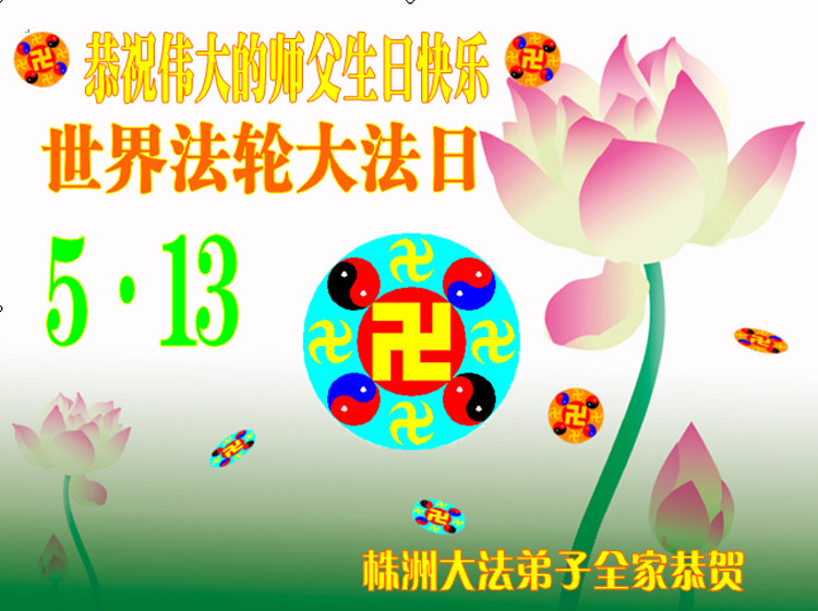 又迎來了2013年的5•13世界法輪大法日,天上、人間都在感恩師父正法的浩蕩洪恩,沒有師父的慈悲救度,這一切都已不復存在了。師父來了,帶著宇宙眾生的希望來了!師父為宇宙眾生、為弟子耗盡了一切。想到師父的承受,弟子淚流滿面。而且有的是弟子們永遠都不可能知道的。現在的時間又是師父用巨大承受延長來的時間,弟子唯有將生命溶於法中,圓容師父所要的,實現生命來在這裏的意義。唯願能減少、減輕師父的操勞。在這普天同慶的日子裏,株洲大法弟子恭祝師父生日快樂!同慶世界法輪大法日!同賀大法洪傳21週年!更加精進實修,多救人,走好最後的路。