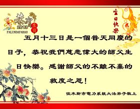 在5月13日師父62華誕到來之際,內蒙古呼倫貝爾大法弟子恭祝師父生日快樂,福澤寰宇!祝願法輪大法洪傳成功!弟子將按大法要求,靜心修煉,做好三件事,功成圓滿,隨師回家!