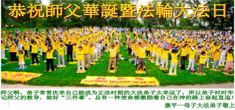 康平一對母子大法弟子恭祝師父華誕暨世界法輪大法日